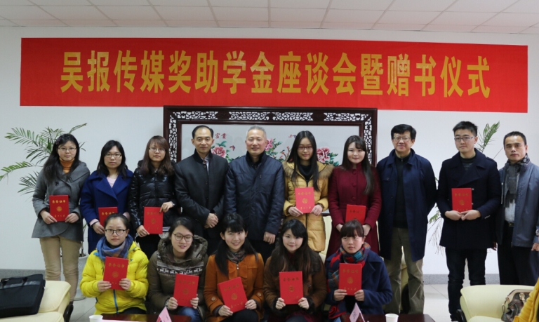 3月11日下午,吴报传媒奖助学金座谈会暨赠书仪式在凤凰传媒学院学术活动中心隆重举行。吴江日报社长徐国平先生、总主编王庆先生、副总编辑杨晓容先生一行,省级研究生工作站吴江市吴风越韵新闻文化信息传播有限公司负责人徐国源教授,校学生处副处长陈平,凤凰传媒学院院长陈龙、党委书记于毓蓝,以及获奖研究生和本科生代表出席了本次座谈会。会议由学院副院长、副书记常青伟主持。