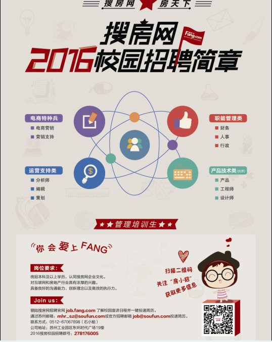 通过苏州邮箱:mhr_sz@soufun.com或官方招聘邮箱job@soufun.com投递简历。