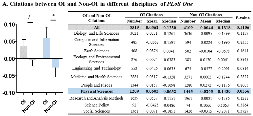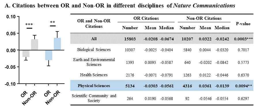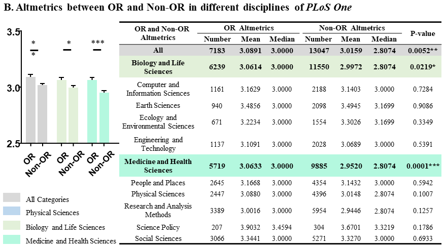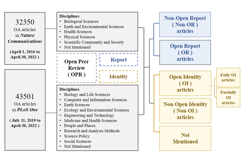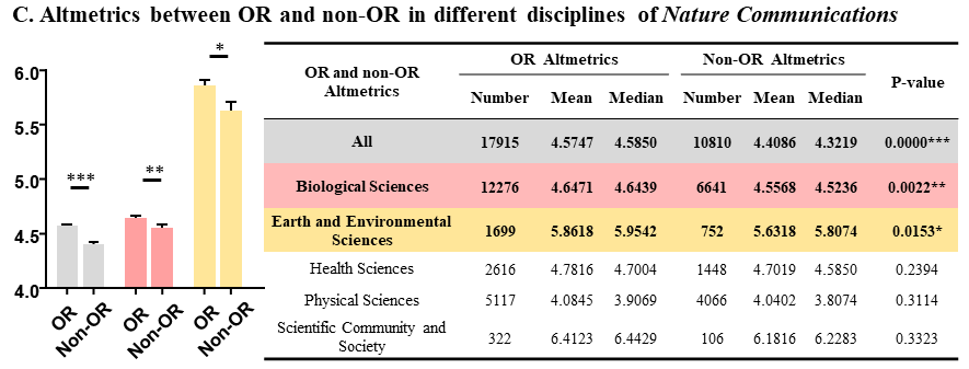 本研究收集了32350篇Nature Communications 期刊文章和43501篇PLoS One期刊Article类型文章的引用率和社会及媒体关注度数据,根据开放同行评议下的 “开放评审报告”(Open Report,OR)和“开放审稿人信息”(Open Identity,OI)两个维度进行编码。研究在消除发表时间对论文引用率和社会及媒体关注度的影响后,发现在Nature Communications期刊中,不开放评审报告文章比开放文章在期刊在引用率上反而更高,且具有显著差异。该结果也适用于开放与不开放审稿人信息维度的比较。但是在社会及媒体关注度上,两个维度上的比较结果截然相反,开放评审报告和开放审稿人信息文章在社会及媒体关注度上却呈现出显著优势。开放评审报告或开放审稿人身份信息的Nature Communications 期刊文章的社会及媒体关注度数据会比不开放的更高。在PLoS One期刊中的趋势与Nature Communications相似,只是开放审稿人信息的文章在引用量上高于不开放的文章,但是差异不具备显著性。