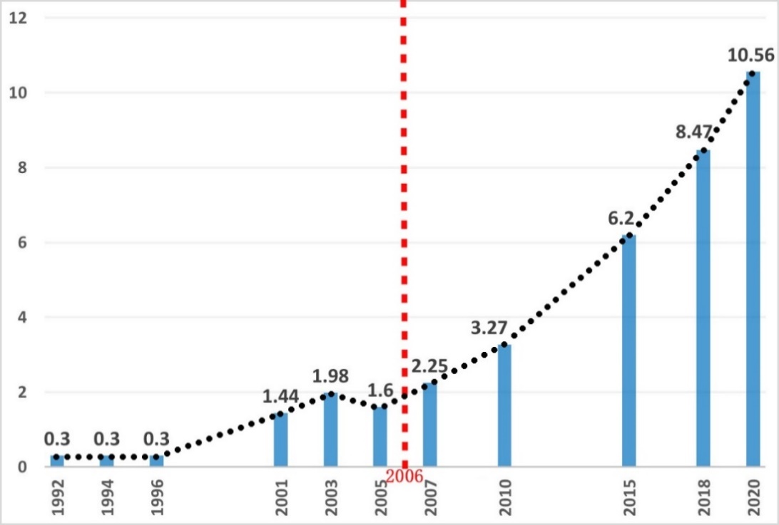 提高全民科学素质是建设科技强国的必经之路,研究以《全民科学素质行动计划纲要(2021—2035年)》(简称科学素质纲要)的发布为契机,结合科学素质纲要(2006-2020年)执行期间的历次调查数据回顾了全国公民科学素质发展过程。如图1所示,我国的公民科学素质的总体呈现出不断提升的趋势,2006年前增加较慢且存在波动,而2006年颁布全民科学素质行动纲要后,增长速度明显提升。从不同群体来看,男性、城镇居民和中青年群体的公民科学素质偏高,且持续增长(表1)。