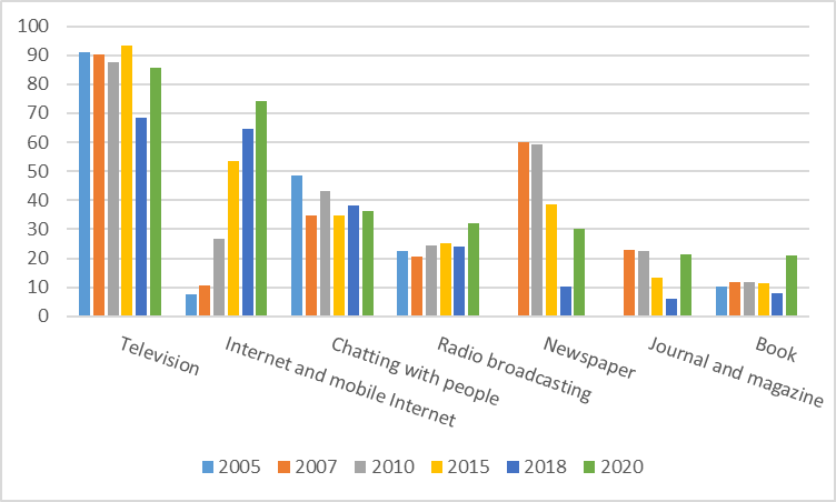 接着从正式教育和非正式教育两个方面对科学素质的影响展开具体分析。从正式学校教育看,学历越高则公民科学素质水平越高,大学本科以上学历者的科学素质从2007年的18.7%增长到2020年的38.89%。而初中与小学及以下群体的素质水平一直远低于全国平均水平。非正式教育的讨论集中于2020年调查的两个细分指标:“公民获取科技发展信息的渠道”(图2)和“公民参观利用科普场所的情况”。数据显示公众获取科技信息最主要的渠道长期以来一直是电视媒体,同时选择互联网的公民比例持续上升,2020年互联网(49.7%)开始超过电视(31.9%)成为更多公民的首选渠道。关于科普场馆,动物园、水族馆和植物园一直身居榜首,紧随其后的是图书馆。2005年只有9.3%的人参观科技馆,随着国家层面对科技馆建设的大力投入,到2020年参观率则提升到了37.2%。