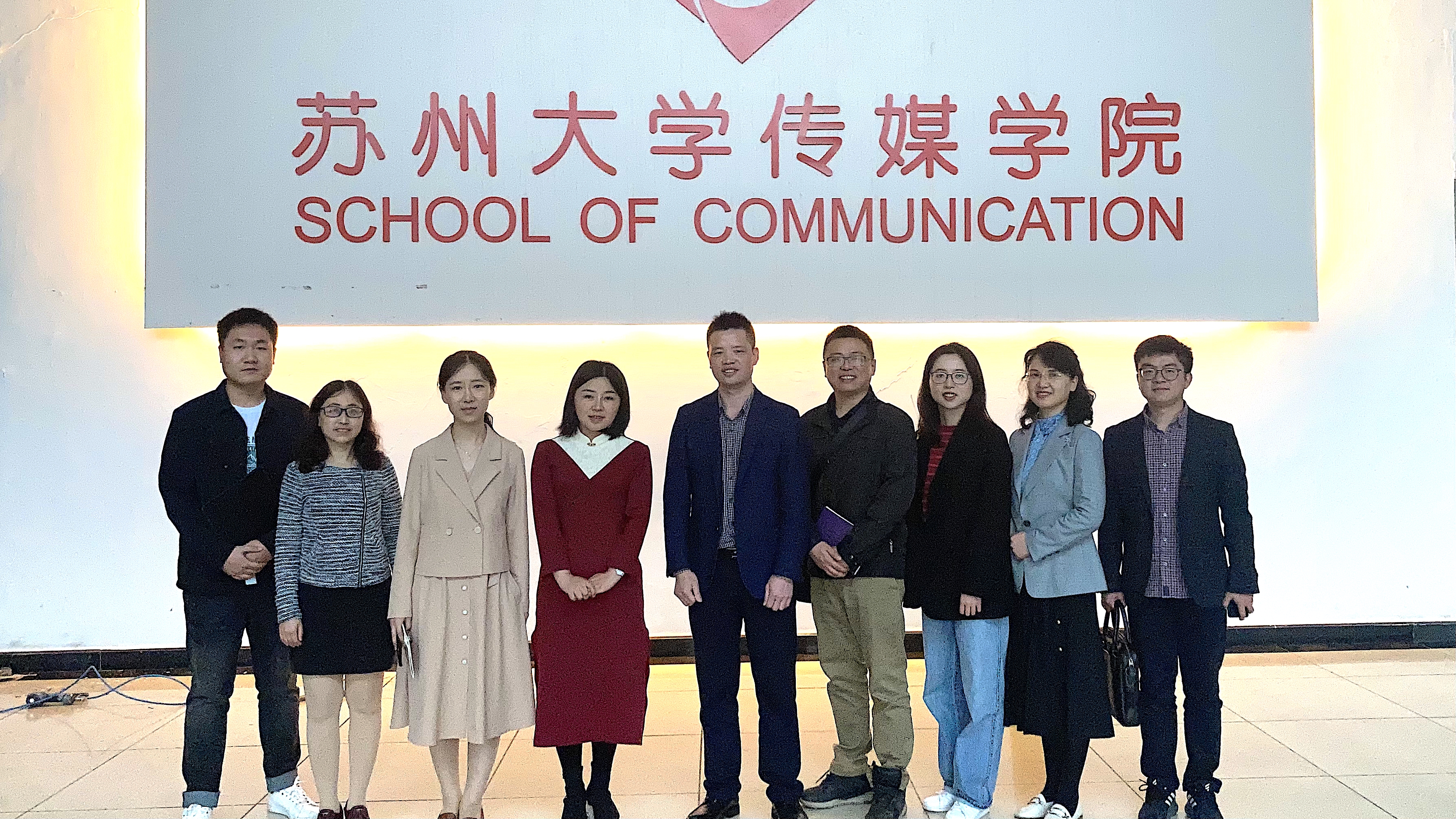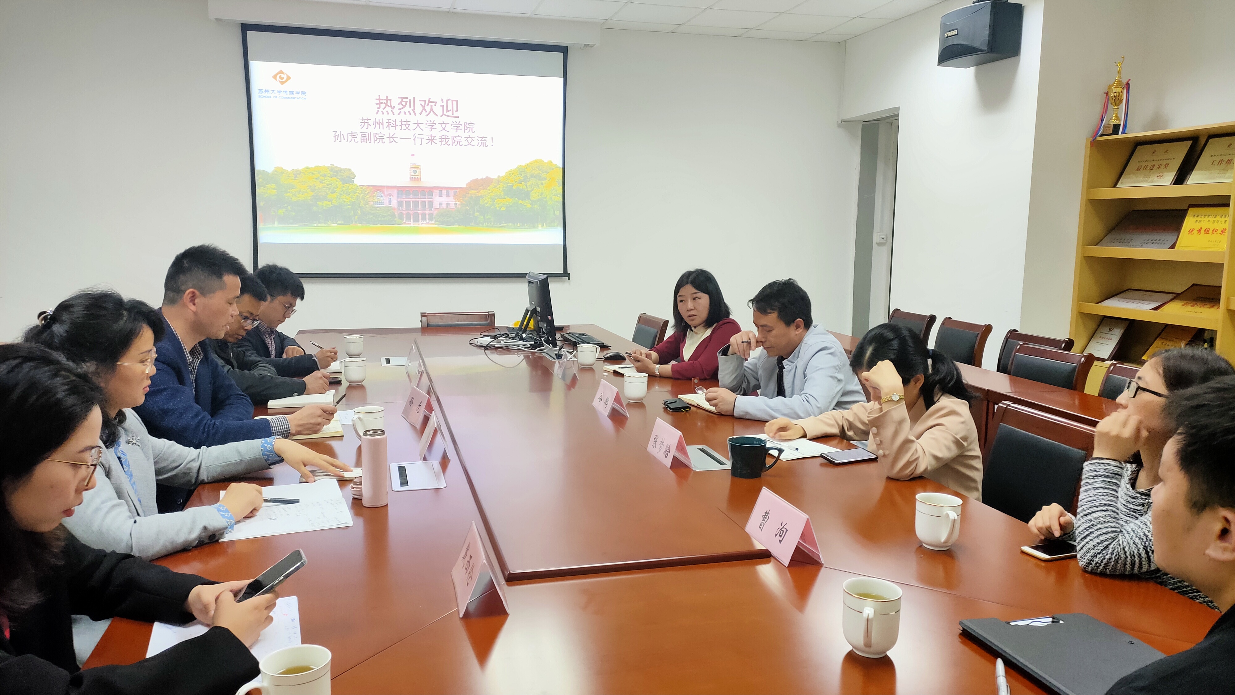 2021年4月27日下午,苏州科技大学文学院副院长孙虎一行来到苏州大学传媒学院,调研网络与新媒体专业的学科建设情况。苏州大学传媒学院副院长谷鹏、数字传播系主任王国燕等,在学院学术活动中心热情接待并就网新专业的建设与发展做了深入交流。