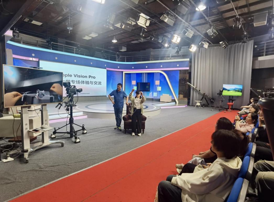 随后,工作人员在演播厅与师生分享、交流。老师和同学们体验了Apple最新推出的头戴式“空间计算”显示设备Apple Vision Pro,感受混合现实、三维影音、数字人和3D可视化等前沿技术魅力。