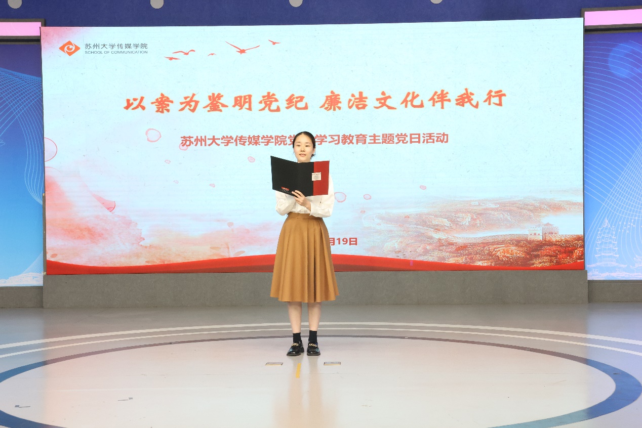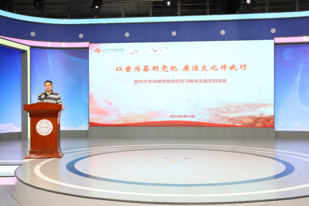 为贯彻党的二十大精神,响应加强新时代廉洁文化建设的号召,推动党性学习教育走深走实, 2024年6月19日下午,苏州大学传媒学院党委举办“以案为鉴明党纪 廉洁文化伴我行”党纪学习教育主题党日活动,提升党员师生纪律意识,弘扬廉洁正能量。