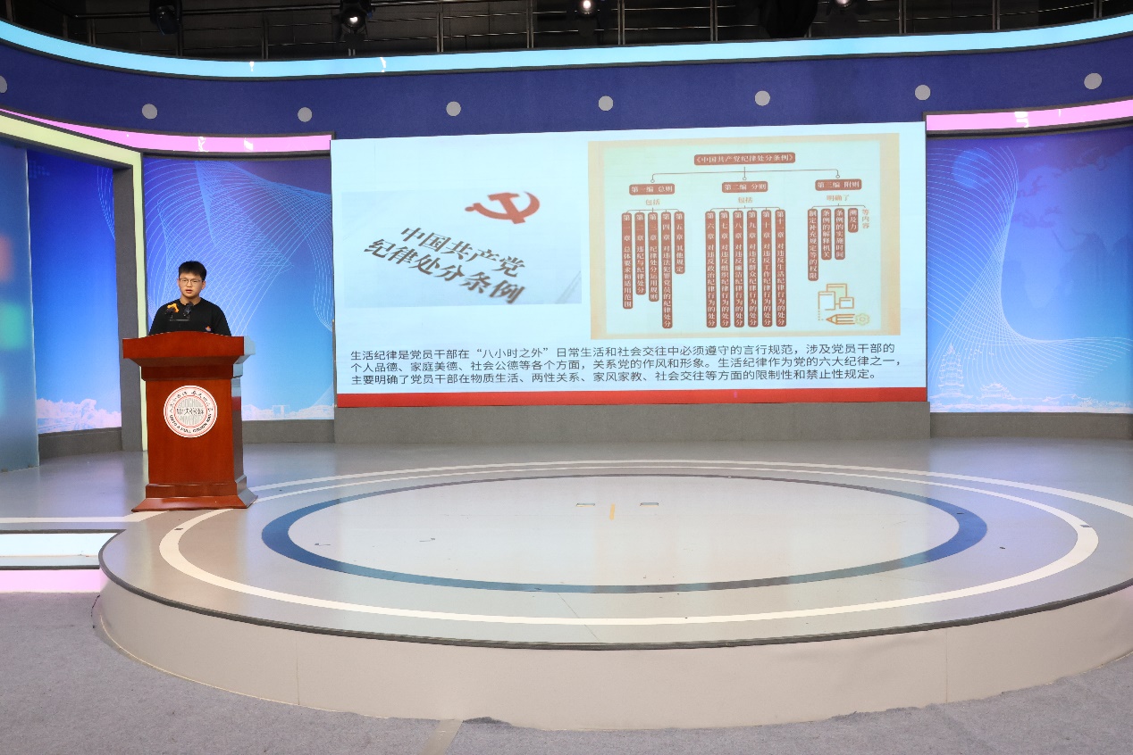 本科生党支部组织委员朱飞首先作题为“欲知平直,则必准绳;欲知方圆,则必规矩”的演讲。他结合违反政治纪律的具体案例,强调了党员干部规范网络行为的重要性与严肃性,并指出师生党员在网络空间言行中应以身作则,率先垂范,真正做到引领新风尚,塑造健康向上的网络空间环境。
