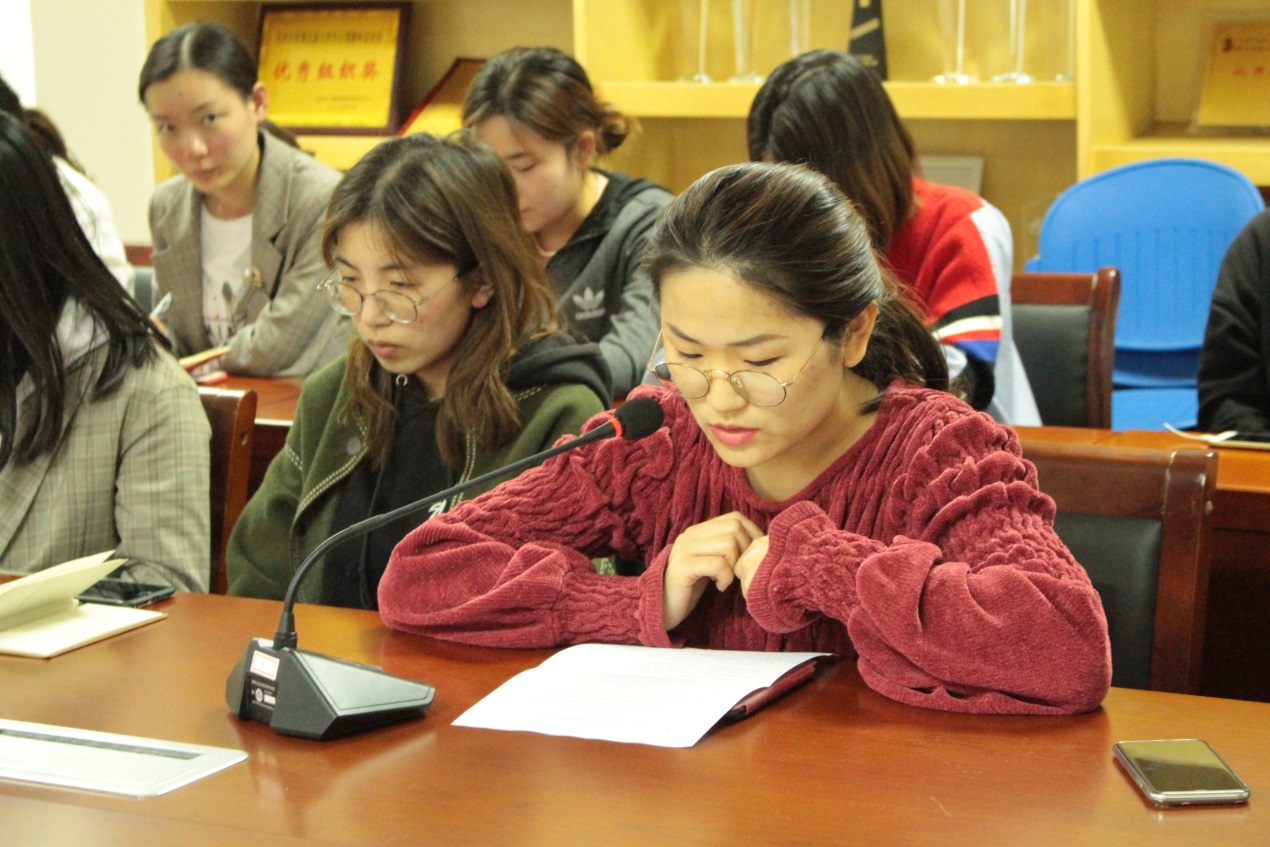 学硕入党积极分子谷文娇同学则将五四精神与弘扬时代精神联系在一起。她提到,五四运动留给我们最宝贵的精神财富就是以爱国、进步、民主、科学为主要内容的伟大精神。“作为当代青年,面对新的形势和任务、面对新的机遇和挑战,我们一定要勇立潮头,开风气之先,奋发进取创时代之伟业,为建设更好地社会做出青年应有的贡献。”