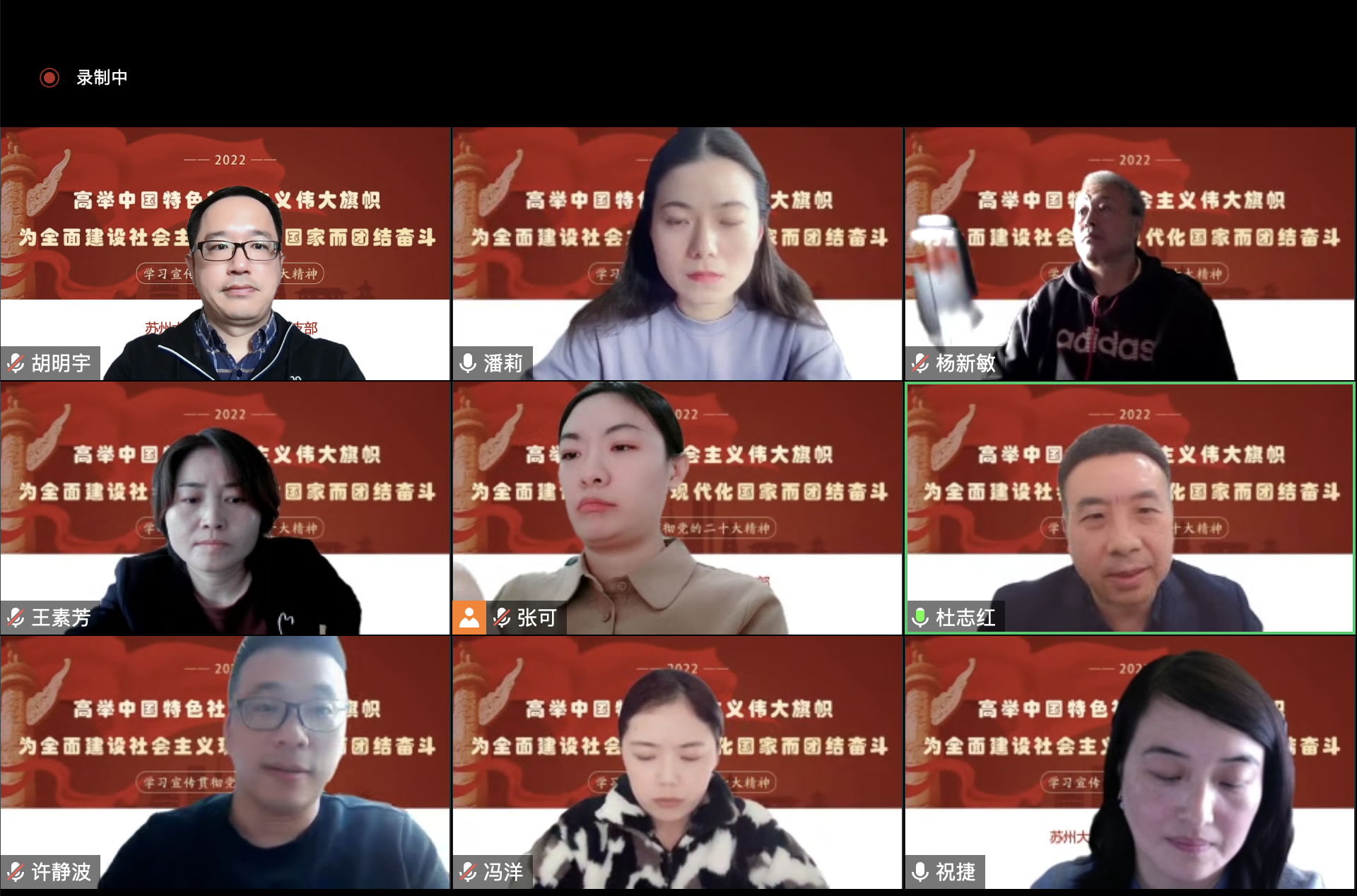 在2022年11月2日下午在线举行的“苏州大学传媒学院教工二支部主题党日活动暨党的二十大精神学习分享会”上,每一个党员结合自身的学习,特别是结合教书育人工作,谈了自己学习党的二十大精神的切身体会。