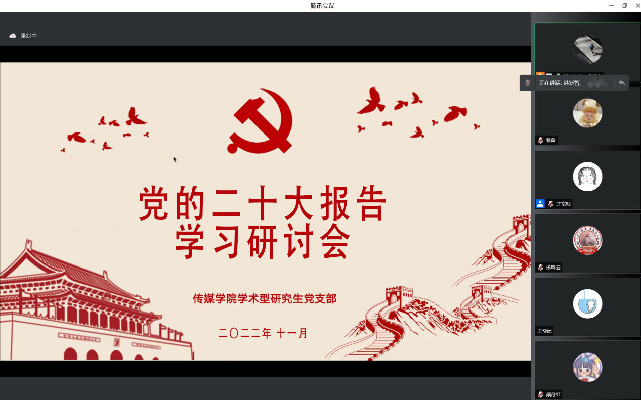 2022年10月16日和11月2日,传媒学院学术型研究生党支部在党的二十大召开之际,为加强支部正式党员与入党积极分子的思想理论学习,采用线上直播自主学习、线上集中研讨学习两种方式开展党的二十大主题报告理论学习活动。