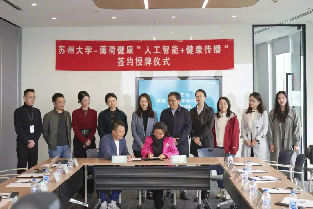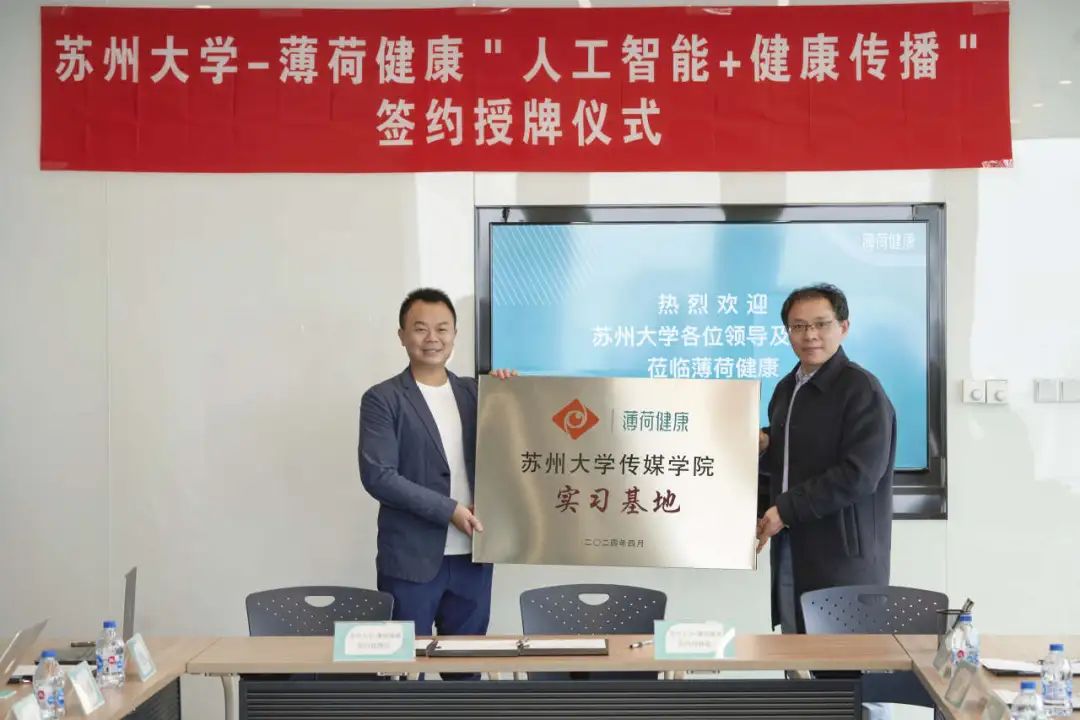 随后,张健书记向薄荷健康授予了“苏州大学传媒学院实习基地”牌匾,标志着双方在健康传播领域人才培养的合作启动,将为传媒学院学生提供更多实习就业机会,推动科技与健康产业的融合发展。最后,双方共同签署了“人工智能+健康传播”的战略合作协议,并就人才培养、科研合作等方面展开了详细的交流与探讨。