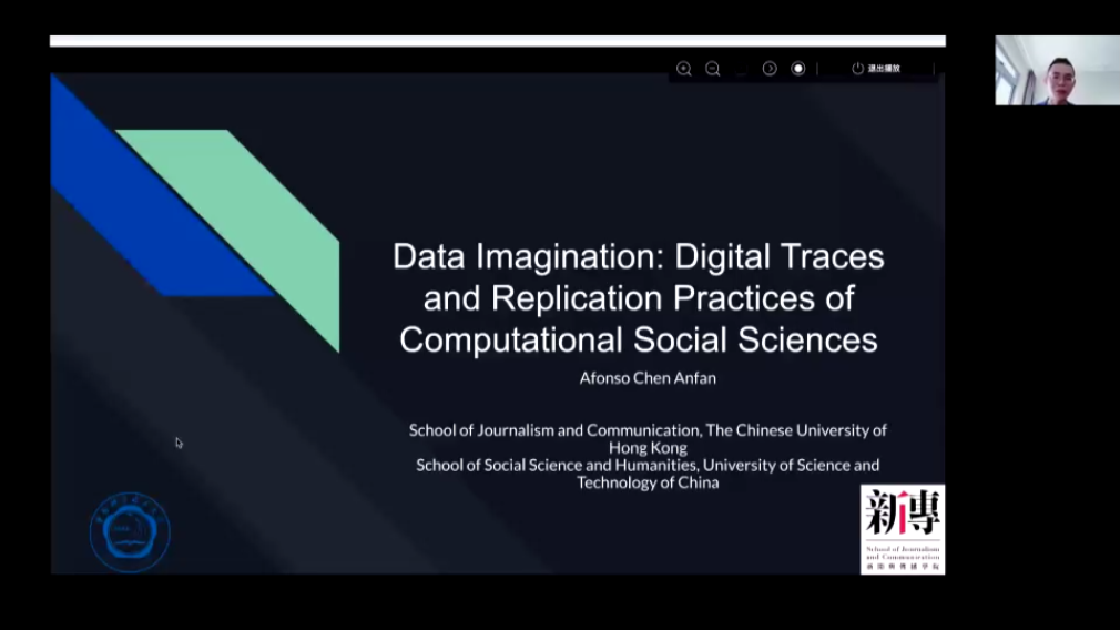 12月6日上午,应苏州大学科技传播创新团队的邀请,香港中文大学新闻与传播学院博士后研究员,中国科学技术大学人文与社会科学特任副研究员陈安繁做客苏州大学“科技传播与新媒体论坛”,作了题为“数据的想象力:社交媒体数字足迹与计算社会科学研究的概念化”的云报告。